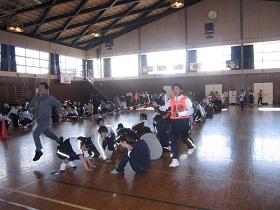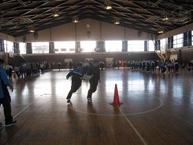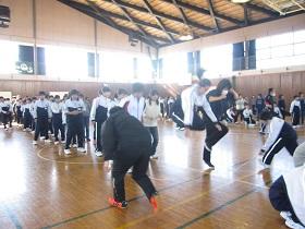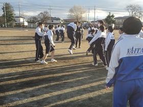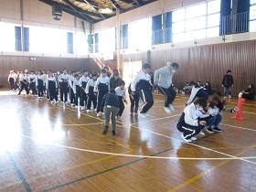 高原山には雪雲がかかり、冷たい高原下ろしが吹き付ける中でしたが、放課後を利用し生徒会主催のスポーツ大会が開催されました。寒さを物ともせず、体育委員会が中心となって「大縄八の字回旋跳び」が行われました。