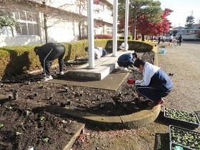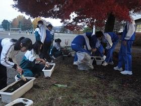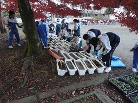 11月21日(火)の放課後には、生徒会緑化委員会の臨時活動がありました。日没が早まり、曇り空の影響もあり薄暗い中でしたが、緑化委員会は、花いっぱい運動としてプランターへの苗の移植作業を行ってくれていました。着々とよりよい学校づくりに積極的取り組んでくれている様子が見られました。