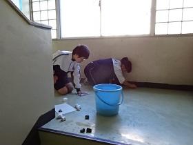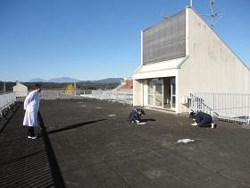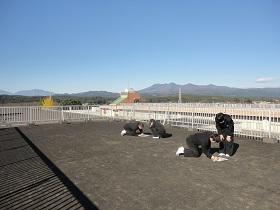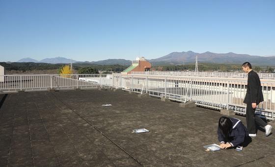 太陽観測は、透明半球を使って、太陽の一日の動きを調べる活動です。生徒は、約1時間おきに屋上に設置した“透明半球”に、サインペンでマークを付けに行きます。今日の天気は、快晴で太陽観測にはもってこいの日だったと思います。屋上からは、高原山や遠くには男体山や女峰山などの日光連山も望むことができました。