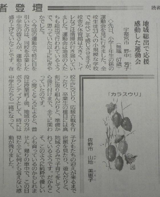 先日、豊田小の校長先生から連絡があり、11月15日付け「下野新聞」の「読者登壇」の中に、豊田小学校の運動会についての投稿記事が掲載されているということでした。記事の内容は、お孫さんの運動会の見学を通しての感想ですが、地域総出の運動会の中で、同校を卒業した中学生の活躍に感動したという内容でした。