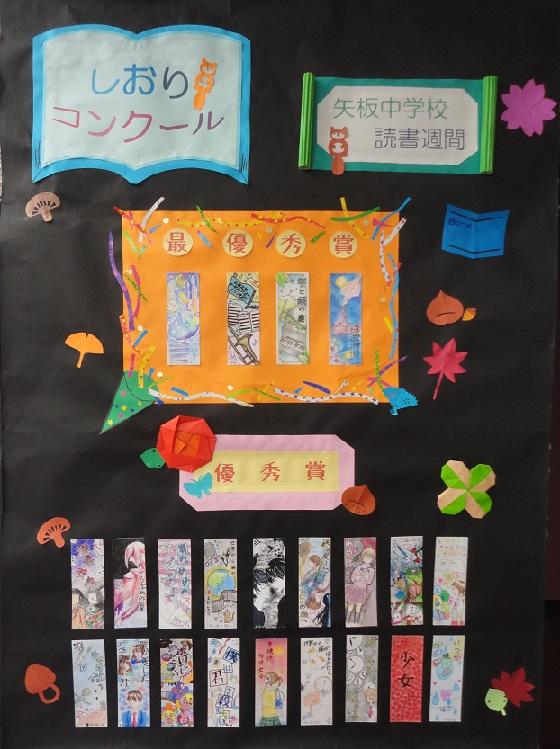 本校では「読書週間」の期間中、恒例の「校内しおりコンクール」を実施しました。生徒たちは、人気の図書などをモチーフにした『しおり』を作成し、よく描けている作品については「賞」を付けて矢板市図書館に展示し紹介しました。