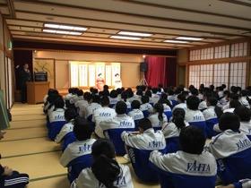 舞妓さんの踊りにうっとり、心も洗われました〜。担当の方より、舞妓さんの説明をしていただき、また、生徒からの質問にも丁寧に応えてくれました。更に、舞妓さんと一緒にステージに上がって踊りの体験をしました。