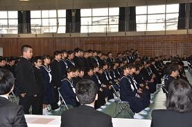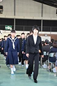 新入生は少し緊張しているようでしたが、参列者の拍手に包まれ学級担任の誘導で入場し、式が始まりました。学級担任からの“新入生呼名”では学校長の確認にしっかりと視線を合わせて元気な返事をしている新入生も数多見られ、各小学校での規律正しい生活が伺えました。また、2・3年生年生も上級生らしく厳粛な態度で参列するとともに、式の最後の校歌斉唱では新入生を後押しするような歌声で、すばらしい態度で式に臨めていました。