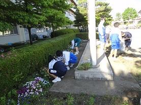 緑化委員会では、春先から今までの長い間、我々の目を楽しませてくれた校舎前の花壇やプランターのパンジーやビオラの苗を整備しました。