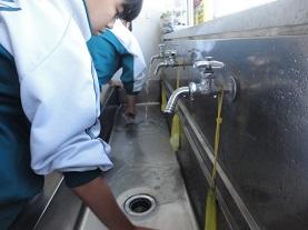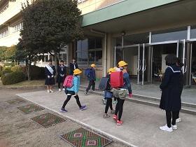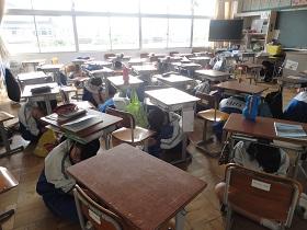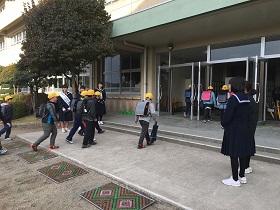 実際の訓練では、主幹教諭の避難訓練実施の校内放送を聞き、まず、地震が発生したことを知らせるアナウンスと「揺れが収まるまで身を守ってください。」という放送があり、生徒達は“第1次避難”で机の下に身を隠しました。揺れが収まったところで調理室からの火災発生の放送の後、第2次避難として避難場所に避難することができました。