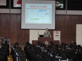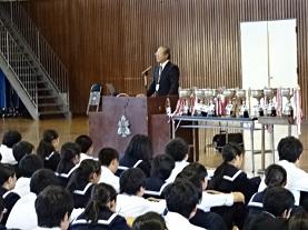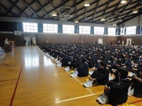 始業式では、まず始めに学校長から、秋休み中に行われた様々なイベントについて生徒の活躍の様子を称えるとともに、秋らしい気候になってきたことから「○○の秋」を連想させ、食欲・読書等が出る中、勉強にも運動にも、読書にも最高の季節、何にとっても良い季節ということから、充実した実りの多い学校生活にしてほしいので「充実の秋」を目指してほしい旨の話しをしました。特に、心を豊かにするためにも、読書の大切さについて取り上げ、心の成長と学力向上のためにも良書に触れることを勧め、図書委員会で取り組んでいる「読書10000ページ」を目指してほしいと締めくくりました。