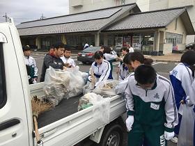 黙々と道路沿いや稲刈り後の田んぼの中、川沿いや用水路の中まで降りてゴミを拾う生徒もいました。ゴミ袋いっぱい拾い、軽トラックいっぱいにゴミが集まりました。学校に持ち帰ったゴミの山を、剣道部員たちが分別し処分してくれました。