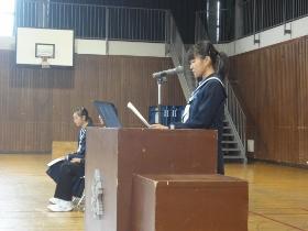 式の後、各学年の代表生徒3名による“2学期の抱負発表”を行いました。それぞれが、今までの自分を振り返り2学期に頑張りたいことを堂々と述べることができました。立派な発表に、全校生からも大きな拍手が贈られました。