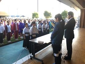 今年度の団員は12名です。矢中からは5名の2年生が参加します。参加団員の紹介の後、参加団員を代表して泉中の女子生徒が「誓いの言葉」を団長さんに向けて述べました。