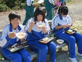 抜けるような秋空の元、片中生や矢高生のボランティアと一緒に、競技に参加したり、ダンスパフォーマンスに加わったりして、それぞれに、運営のお手伝いなどを積極的に行う姿が見られました。また、活動後にはお弁当と一緒に豚汁や綿アメもご馳走になり、美味しくいただきました。