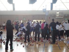 職員の健康増進と親睦を図り、職員間のチームワークの向上を目指して、ソフトバレーボールに似た“さいかつボール”のゲームを行いました。学年対抗ということで、1点を争う真剣勝負の試合が展開され、和気あいあいの中、有意義な研修となりました。