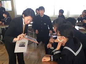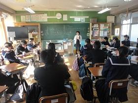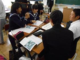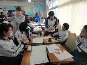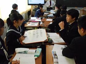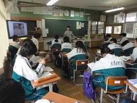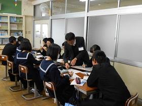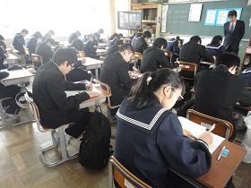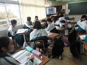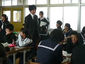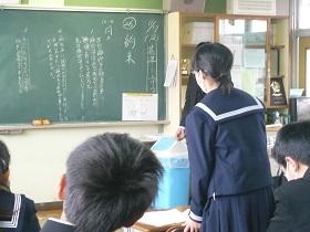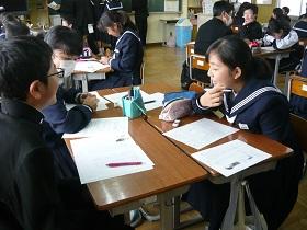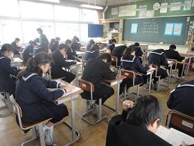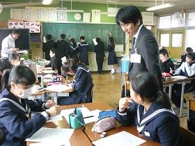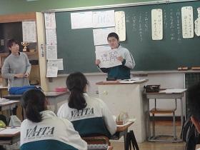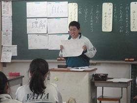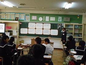 1年2組での国語科の研究授業では、学級担任(実習担当教諭)などの参観者が見守る中、「読むこと」の授業を行いました。授業では“ねらい”をしっかりとおさえるとともに、ワークシートを活用しながら、スムーズに学習活動が展開していました。生徒たちにも緊張の様子が見られましたが、徐々に慣れてくると、意欲的に挙手をして活発に発表しあう様子が見られました。教生さんも適切な助言やユニークな具体例などを示すなど、子ども達が表情良く活動する姿が印象的でした。
