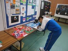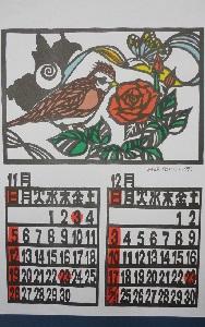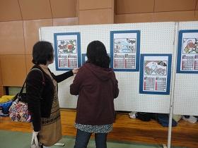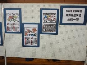 また、中学校合同作業で取り組んできた来年度のカレンダーも展示されていました。来年度のテーマは「関東の県鳥・県花」ですが、多色刷りの切り絵の版画作品は、見学者の目を引いているようでした。