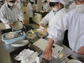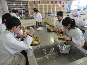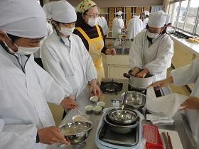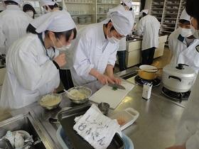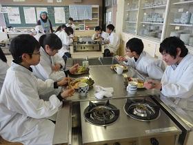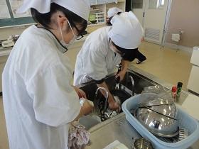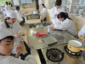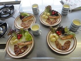 1年生の家庭科の調理実習も最後のクラスとなりました。今まで学習してきたことの総まとめとして、今回も、調理の基礎技能として、肉・魚・野菜の調理を工夫しようという目当てで、「豚肉生姜焼き・鮭のムニエル・粉ふきいも・コーンクリームスープ」を作りました。