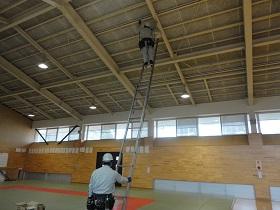 また、武道場もランプの交換を行いましたが、こちらは、ハシゴを延ばしての交換作業でした。不安定な状況でもキッチリと仕事をこなせるのが、プロの作業技術だと思いました。