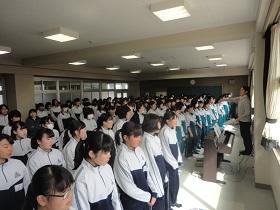 続いての、水越先生からの話は、卒業式に向けての全校合唱についての話でした。音楽科を担当している先生からは、2年生への期待を込めての卒業式の歌でのベストパフォーマンスを発揮してほしい旨の話でした。