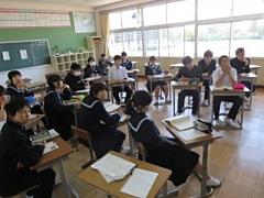 午前中、英語科の授業(写真)を参観しましたが、教科担任と生徒間の距離が近くなり、生徒たちが回りの友達の顔が見られて笑顔がたくさん見られました。「学び合い」がし易く、2人組みも「横の子と」「前と後ろの子と」など、バリエーションもあります。