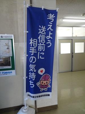 最近、SNSを巡るトラブルが頻発しており、矢板市においても例外ではないとのことから、このようなのぼり旗を作成し、各校に配っていただいたものです。