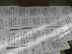 たくさんの賞状の写真は、下野教育書道展での入賞生徒の賞状です。「奨励賞」以上の賞状、生徒81枚のものを午前中に筆書きしました。