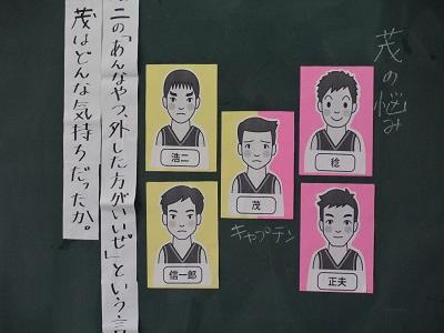 1-2では、「ルールやきまりはなぜ必要なのか?」というテーマで、2-2では、「部活動の新チームになって、下手でも2年生を使うのか、それとも上手な1年生を使うのか、キャプテンとしてどう判断するか」という内容です。