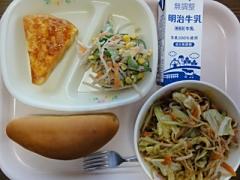 <食育コーナー「今日の献立」>ミニハチミツパン、牛乳、焼きそば、アンサンブルエッグ、ごぼうサラダでした。 「アンサンブルエッグ」って何かな? 私も同じことを考えました。すると、廊下の「給食ガイド」に答が書いてありました。イギリスでは「スパニッシュ・エッグ」と言われ、世界中に同じような料理があるようです。日本の「お好み焼き」もそのお仲間のようです。 「アンサンブルエッグ」は中に、ジャガイモが必ず入るのが約束のようです。