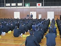 4 最後に、今年度の「締め」ということで、生徒と職員全員で、「よーお、シャシャシャン、シャシャシャン、シャシャシャンシャン、よお・・・・・・」と手拍子で、「三三七拍子」をして校長の話は終わりました。最後に生徒たちから拍手がでました。