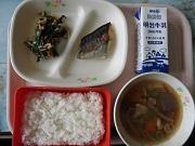 <食育コーナー「今日の献立」> 今日の献立は、ごはん、牛乳、とろあじの一夜干し、小松菜のごま和え、豚汁でした。 「とろあじ」は、身が厚くてこんな美味しい「あじ」ははじめてです。