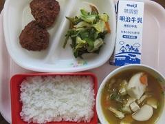 <食育コーナー「今日の献立」>今日の献立は、ごはん、牛乳、ソースカツ(2枚)、茎わかめの即席漬け、けんちん汁でした。 「ソースカツ」は、カツにかかっているソースの味が絶妙でした。3年の県立一般入試に「勝つ」という、伊藤先生の思いと願いが伝わってきました。
