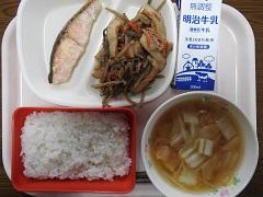 <食育コーナー「今日の献立」> 今日の献立は、ごはん、牛乳、鮭のマヨネーズ焼き、五目きんぴら、白菜の味噌汁でした。 受検しない3年は午前中、給食なしで下校しています。 「五目きんぴら」は、ごぼう、ニンジンの他に豚肉やこんにゃくが入っていて美味しくできていました。