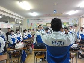 また、帰りの会の終了時には、校内放送で式歌“仰げば尊し”と“大地讃頌”を流しての、クラスごとの一斉練習も始まりました。初日の今日は、“大地讃頌”を練習しましたが、指揮者を務める工藤君のいる3-2の様子を紹介します。