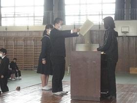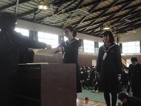 また、5校時には、3学年が体育館で「卒業証書の授与」の仕方について、流れや立つ位置、来賓への礼の仕方などについて練習していました。担任の先生からの呼名を受け、「返事」をして、卒業証書を受けるまでの流れや所作についての、初めての経験でした。卒業式は、3年生が主役です。堂々とした立派な態度で証書が受け取れるよう期待しています。