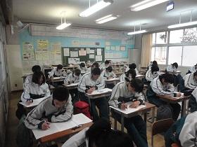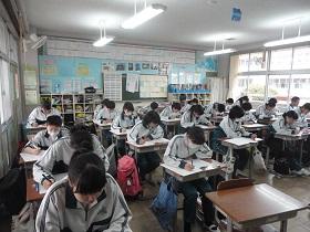 先週の金曜日には、県立高校一般選抜受検者を対象に、事前指導が行われましたが、今日は、5教科の「学力検査」に挑戦しています。入試直前にインフルエンザでの出席停止者がいましたが、入試当日には完治し通常通りの学力検査を行うことができました。それぞれの目標に向かって、ベストを尽くしテストに取り組んでいることと思います。