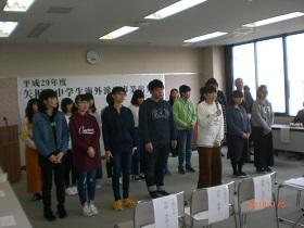 本日、9時30分から矢板市生涯学習館で「矢板市中学生海外派遣出発式」が行われました。「出発式」には、市長さんを始め、多くの来賓の方が見え、激励の言葉をかけてくれました。実行委員長(団長)の村上教育長さんや市長さんのあいさつは、英語から始まり海外派遣を実感しました。齊藤市長さんからの激励の言葉では、各学校の代表ばかりでなく矢板市の代表として、自覚と誇りを持って充実した研修になることを期待していました。