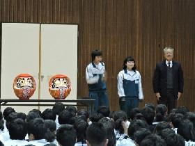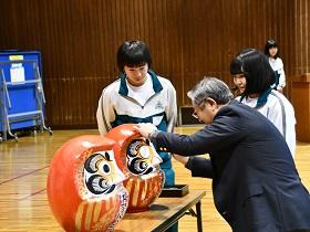 冬休み明け集会の最後には、恒例となっている「だるまの目入れ式」が行われました。50㎝程の“だるま”に、生徒の交通安全と必勝・健康の願いを込め、昨年のだるまには両目を、今年のだるまには左目を入れました。交通委員会の委員長が代表でだるまに願いを託しましたが、生徒一人一人の意識が交通安全や部活動での必勝・健康につながる基ですので、心がけていってほしいものです。
