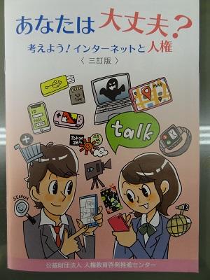 先日、3年生に「あなたは大丈夫?~考えよう!インターネットと人権~」というパンフレットが配られました。ケータイ、スマホにインターネット。どれも大変便利で、矢中生も所持率が高いようです。しかし、使い方を間違えると、いじめや仲間はずれ、性犯罪に巻き込まれるなど、深刻な問題に発展することもあります。これは明らかな人権問題でもあります。
