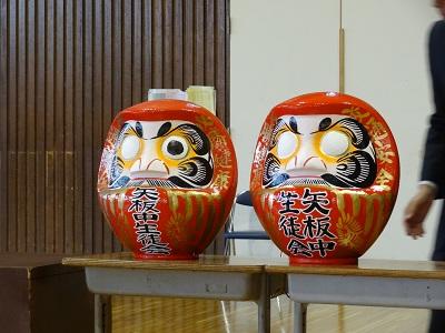 ここでは校長先生の話、新生徒会役員任命式、交通安全だるまの目入れ式が行われました(^_^)