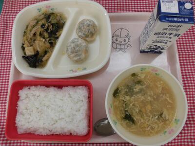 今日の献立は、「中華丼 にらまんじゅう 中華風コーンスープ 牛乳」でした。
