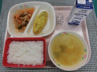 今日の献立は、「ジャンバラヤ ほうれん草オムレツ コンソメ野菜スープ 牛乳」でした。
