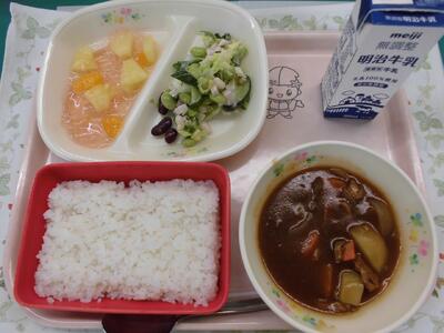 今日の献立は、「ごはん ハヤシルウ ビーンズサラダ フルーツのいちごゼリーあえ 牛乳」でした。