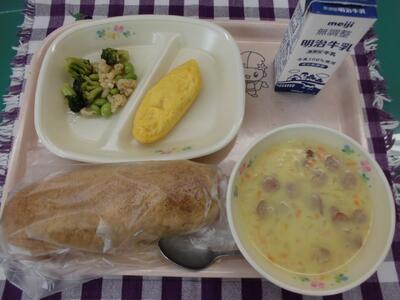 今日の献立は、「きなこ揚げパン プレーンオムレツ 花野菜サラダ 白いんげん豆のポタージュ 牛乳」でした。