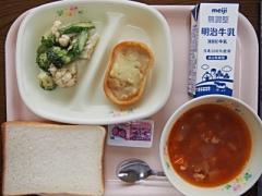 <給食コーナー>今日の献立は、食パン(2枚)、ジャム&マーガリン、牛乳、ポムドカップグラタン、花野菜サラダ、ポークビーンズでした。洋食ランチの雰囲気でいただきました。 花野菜サラダのドレッシングは、「胡麻ドレッシング」で美味しくいただきました。