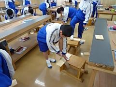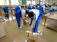 <ペン立て作り(1年 技術科)>1年の技術科では「ペン立て作り」をしていました。 小学校で、のこぎりや金槌を使う学習は図工科等で1,2回はやってきたでしょうが、板切りに悪戦苦闘しながら、それぞれがオリジナルの「ペン立て」を完成することができました。