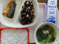 <給食コーナー>今日の献立は、ご飯、牛乳、さばの味噌煮、ひじきの煮物、豆腐とチンゲン菜のスープでした。 「ひじきの煮物」については、豚肉が入っていて甘くなく辛くなくぴったりの味付けで美味しいです。 なかなか現代の家庭では、夕飯に「ひじき」が献立にのぼらないのではないでしょうか?(我が家でも・・・)