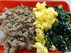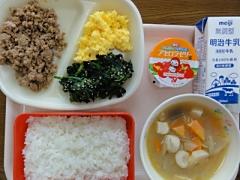 <給食コーナー>今日の献立は、セルフ三色丼(ご飯、肉そぼろ、炒り卵、ほうれん草)、牛乳、けんちん汁、アセロラゼリーでした。 「三色丼」には私は苦い思い出があります。 70年前半の私の中学・高校時代、我が家(貧しかった)の弁当には、「一色丼」または「二色丼」弁当。 時折「三色丼」弁当だと喜ぶやいなや、ピンクのもやもやが? 中身は「桜でんぶ」(どうも苦手なおかず)でした。 ご飯の3分の1が甘くて、食べられなかったという思い出深いメニューでした