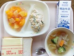 <給食コーナー>今日の献立は、セルフ・ツナサンド(食パン、ツナ和え、スライスチーズ)、牛乳、野菜のポトフ、アセロラポンチでした。 食パン2枚に、チーズとツナ和えをはさんでいただきました。 食パンの苦手な私でも、チーズをはさんだことでツナサンドが食べられました。 「アセロラポンチ」については、生まれて初めて食する「デザート」で感動でした。 「アセロラ」のビタミンで、子供たちや職員たちも「疲れ」がとれたと思います・・・。