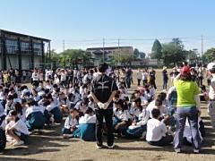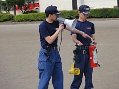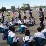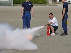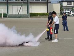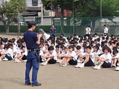 <避難訓練(1回目)>今年度、はじめての「避難訓練」でした。 調理室から出火という放送があり、校庭南側へ避難を開始しました。 消防署員から避難の状況の講評をいただきました。「真剣さを少しなかったかな。」というようなお話をいただきました。 その後、学年代表が出て消火器を使っての消火訓練をして終了しました。