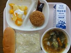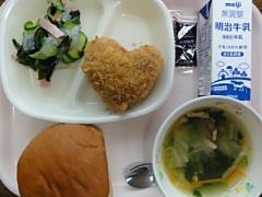 <給食コーナー「今日の献立」>丸パン、牛乳、手作りコロッケ(2年生に)、豚肉コロッケ(1年、3年)、こんにゃくサラダ、野菜ソープ(醤油味)でした。 4月からでは2回目の「手作りコロッケ」をいただくことができました。 検食のコロッケは「♡ハート型」でした。私のだけかな?と思っていましたが、「丸型」や「星型」、「ハート型」などがあるようです。