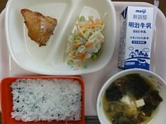 <給食コーナー「今日の献立」>わかめごはん、牛乳、照り焼きチキン、野菜サラダ、なめこ汁でした。 「わかめごはん」は塩味があり磯の香りがして美味しいごはんでした。 「照り焼きチキン」の予想外に大きくて食べごたえがありました。