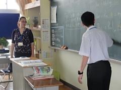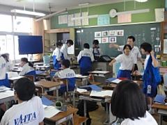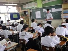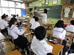 <1年6組 ALTとの授業に>2校時、末広先生とクリスタル先生とのTT授業を参観に、ALTを派遣している会社のコーディネーターさんが来校しました。 3校時は、サイモン先生の授業も参観して帰られました。