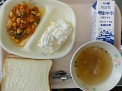 <給食コーナー「今日の献立」>今日の献立は、食パン2枚、フルーツクリーム、牛乳、チリコンカン、ポテトスープでした。 今日のメニューこコンセプトはアメリカ料理(?)でしょうか・・・。「チリコンカン」はアメリカの田舎料理で大豆が入っていて栄養満点です。 「フルーツクリーム」を食パンにはさんで、フルーツクリーム・サンド(私の好きなサンドウィッチの一つです)にしていただきました。